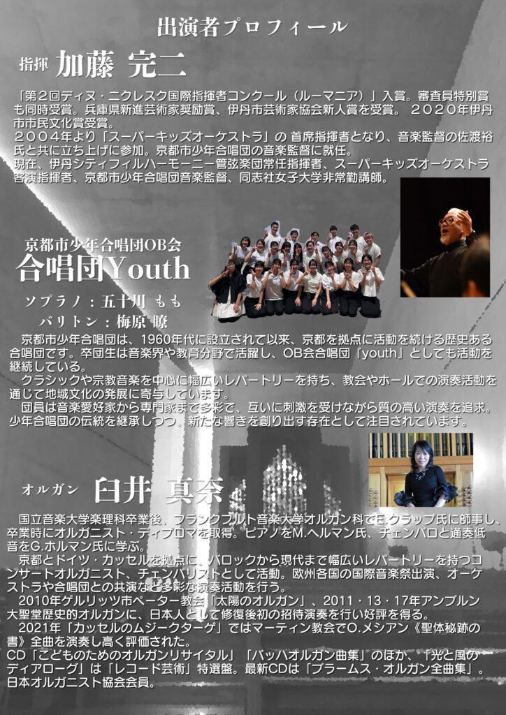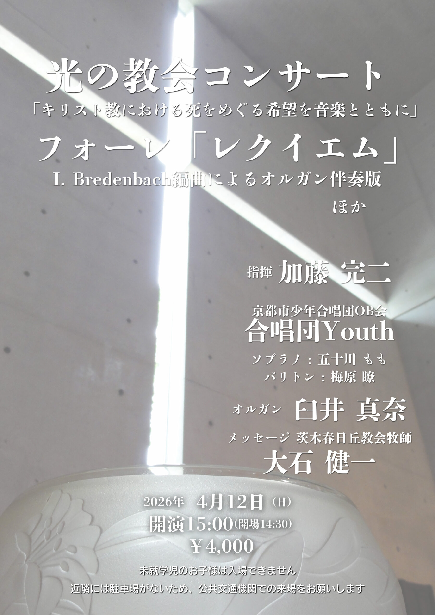 今年はイースター直後であることから、京都市少年合唱団OB会 合唱団Youthの皆さんをお招きして、フォーレの傑作「レクイエム」ほか、そして大石健一牧師によるメッセージを通して「キリスト教における死をめぐる希望を音楽と共に」のタイトルでキリスト教を体験していただきます。